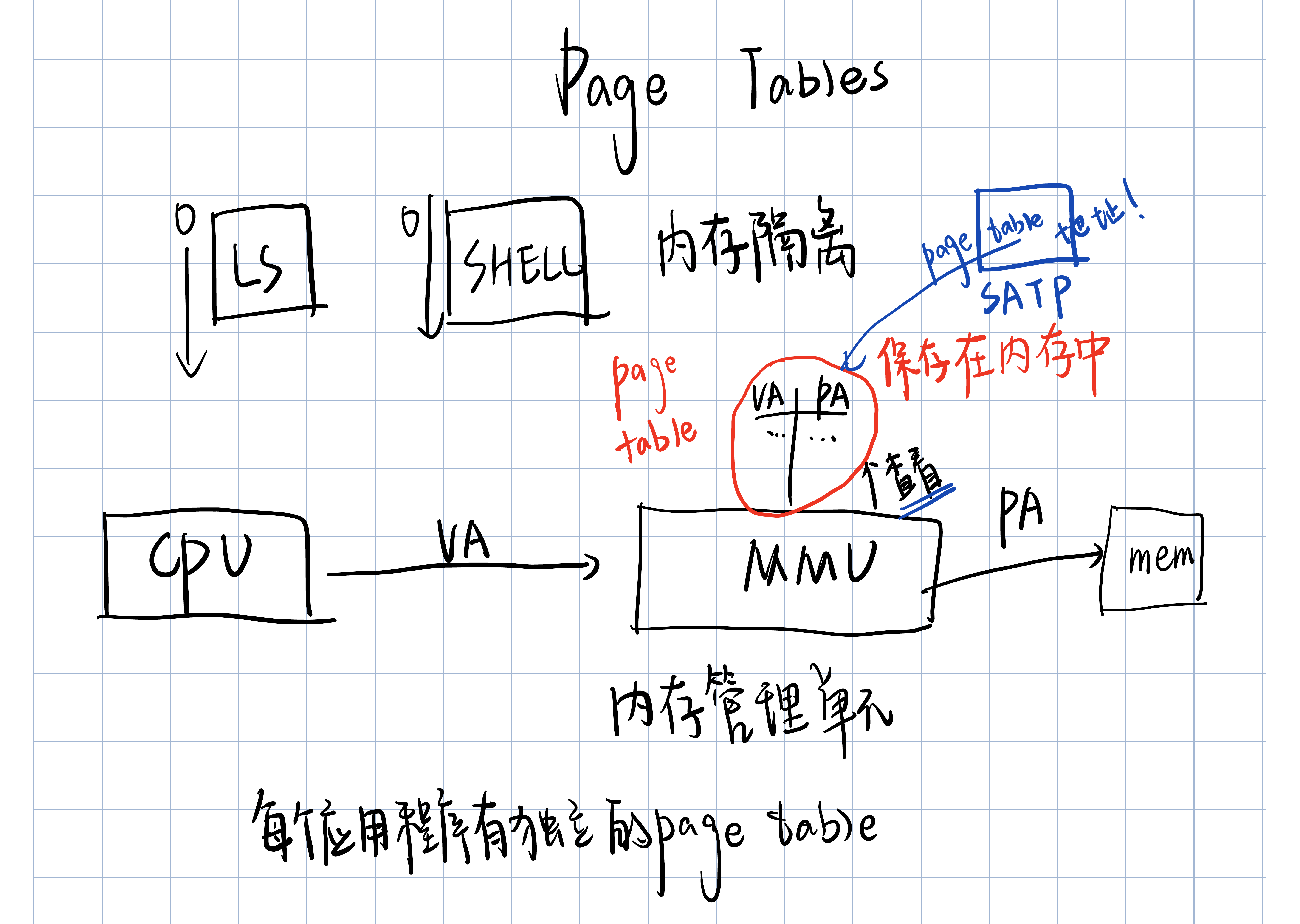 为了能够完成虚拟内存地址到物理内存地址的翻译,MMU 会有一个表单,表单中,一边是虚拟内存地址,另一边是物理内存地址。通常来说,内存地址对应关系的表单也保存在内存中。所以 CPU 中需要有一些寄存器用来存放表单在物理内存中的地址。 现在,在内存的某个位置保存了地址关系表单,我们假设这个位置的物理内存地址是0x10。那么在 RISC-V 上一个叫做 SATP 的寄存器会保存地址0x10。这样,CPU 就可以告诉 MMU,可以从哪找到将虚拟内存地址翻译成物理内存地址的表单。