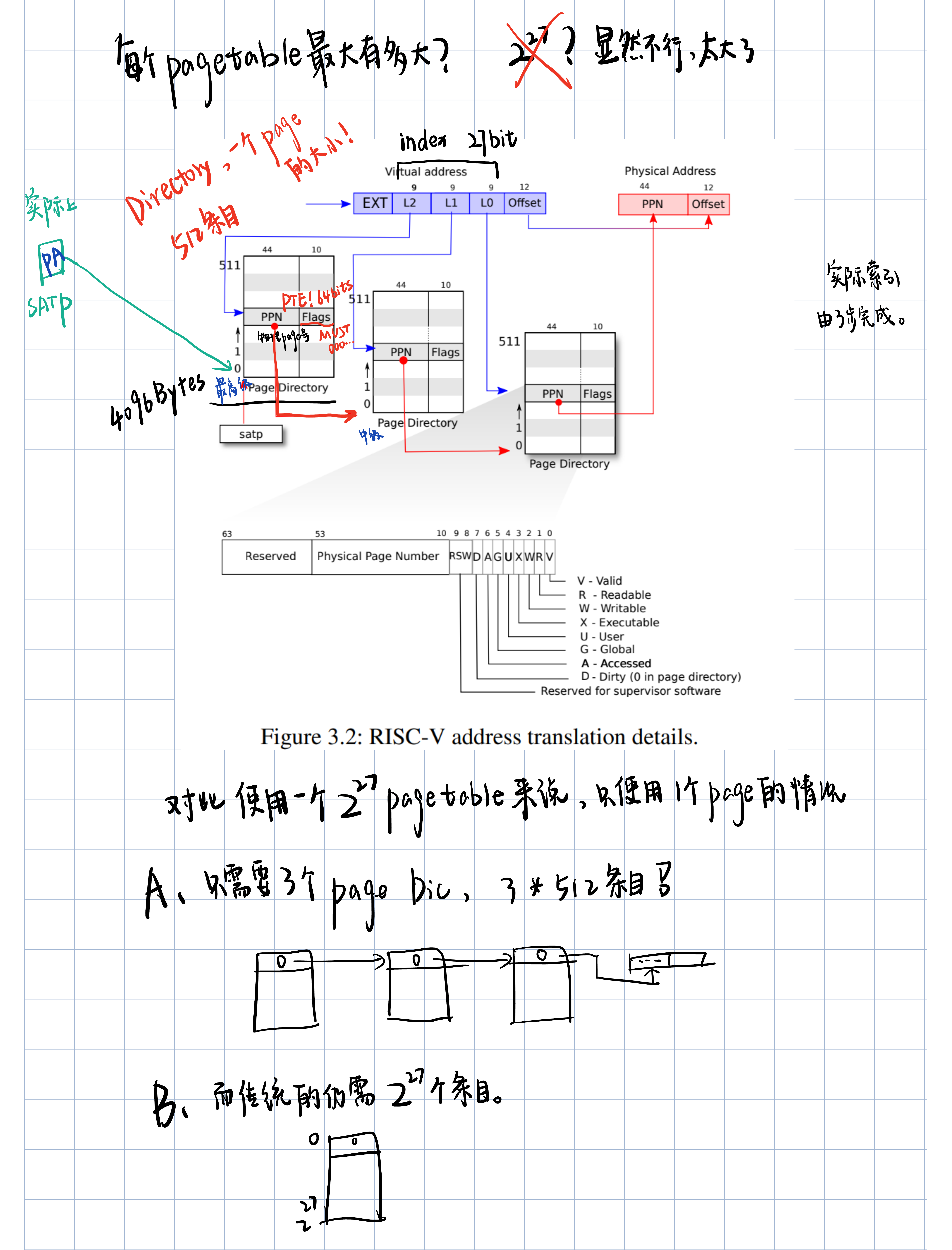 SATP寄存器会指向最高一级的page directory的物理内存地址,之后我们用虚拟内存中index的高9bit用来索引最高一级的page directory,这样我们就能得到一个PPN,也就是物理page号。这个PPN指向了中间级的page directory。